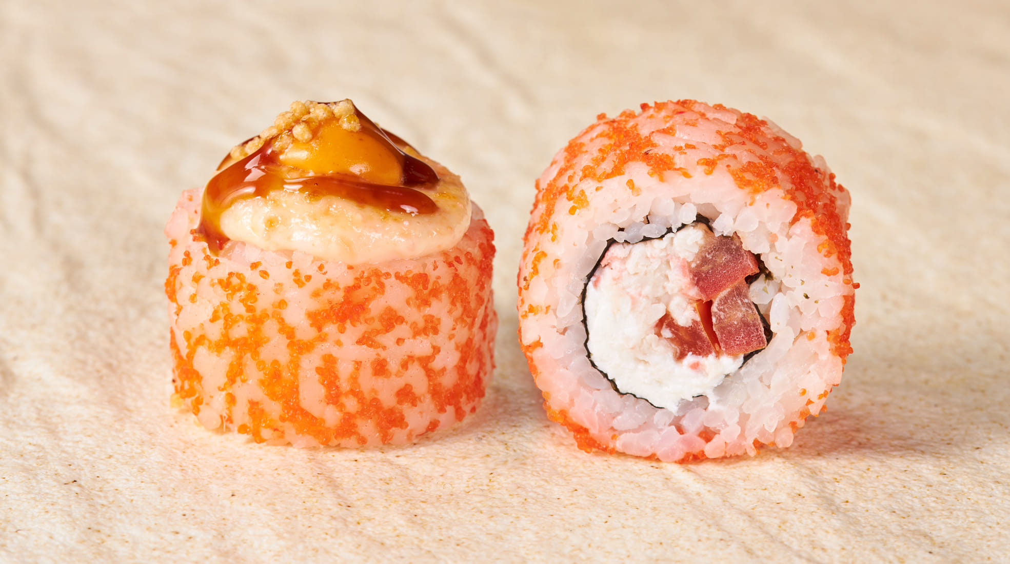 Состав: Крем чиз, крабовые палочки, помидор, икра масаго, фирменный сырный соус, рисовые шарики (том ям), спайси соус, унаги соус, рис, нори. *Не забудьте заказать имбирь, васаби и соевый соус. Они не входят в стоимость заказа. *Внешний вид блюда может отличаться от фото на сайте.